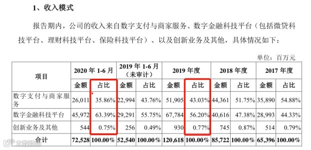 在这次的招股说明书中,这些为外界耳熟能详的多款明星产品背后的经营数据也得到披露。这些明星产品多属于蚂 蚁的数字金融科技平台业务,从招股书披露的收入结构变化看:
