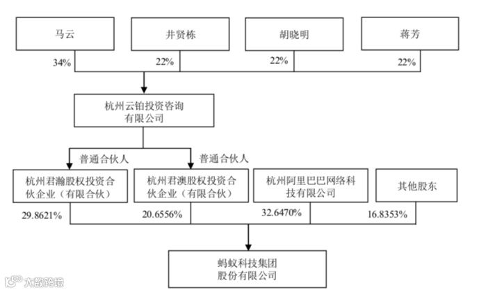 发行后,发行完成后,君瀚、君澳将分别持有23.64%和16.35%,阿里巴巴集团将持股25.84%。君瀚、君澳为蚂蚁及阿里高管员工持股平台,招股书显示,杭州君瀚目前共有4名合伙人,普通合伙人和执行事务合伙人为杭州云铂,有限合伙人为杭州君洁、马云、谢世煌;君澳目前共26名合伙人,普通合伙人和执行事务合伙人为杭州云铂,此外有限合伙人为14名自然人,包括多名阿里及蚂蚁高管及创始团队成员。