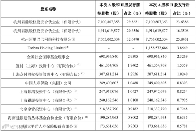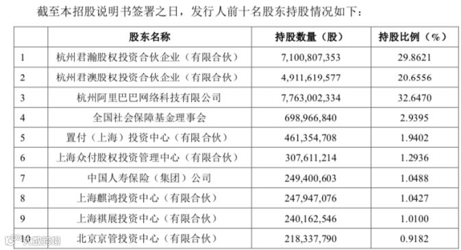 招股书显示,蚂蚁持股5%以上的股东,分别为杭州君瀚股权投资合伙企业(持股29.86%,简称君瀚)、杭州君澳股权投资合伙企业(持股20.66%,简称君澳)以及阿里巴巴集团(持股32.65%);此外,股东名单中多个险资和产业基金现身:全国社保基金理事会持股2.94%、中国人寿(集团)持有1.049%、太平洋人寿持股0.73%,新华人寿持股0.418%、人保资本持股0.539%;北京京管投资中心持股0.918%、海南建银建信丛林基金持股0.8%、北京中邮投资中心持股0.69%。