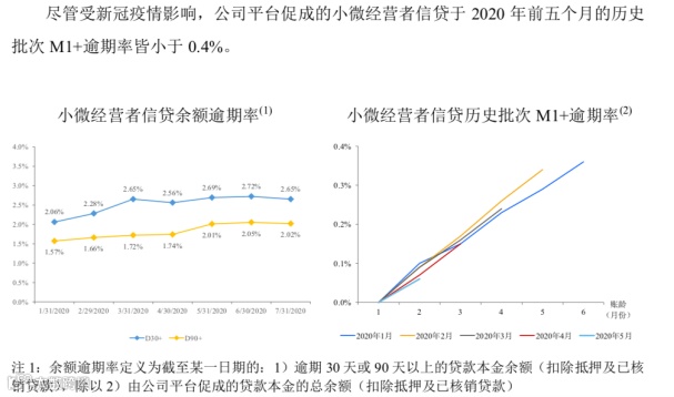 招股书称,尽管受新冠疫情影响,蚂蚁促成的消费贷在今年前五个月的历史批次M1+逾期率皆小于0.7%,从今年2月份开始逐月改善。此外,对于小微经营者的信贷在今年前五个月的历史批次M1+逾期率皆小于0.4%。