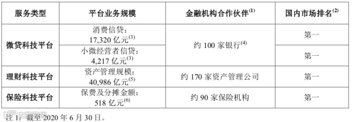 作为中国最大的线上消费信贷和小微经营者信贷平台,截至今年6月30日,微贷科技平台促成的消费信贷余额17320亿元、小微经营者信贷余额为 4217 亿元,与约 100 家银行合作伙伴合作开展业务, 包括全部政策性银行、大型商业银行、全部股份制商业银行、部分城商行、农商行、外资银行,同时也与信托公司合作。