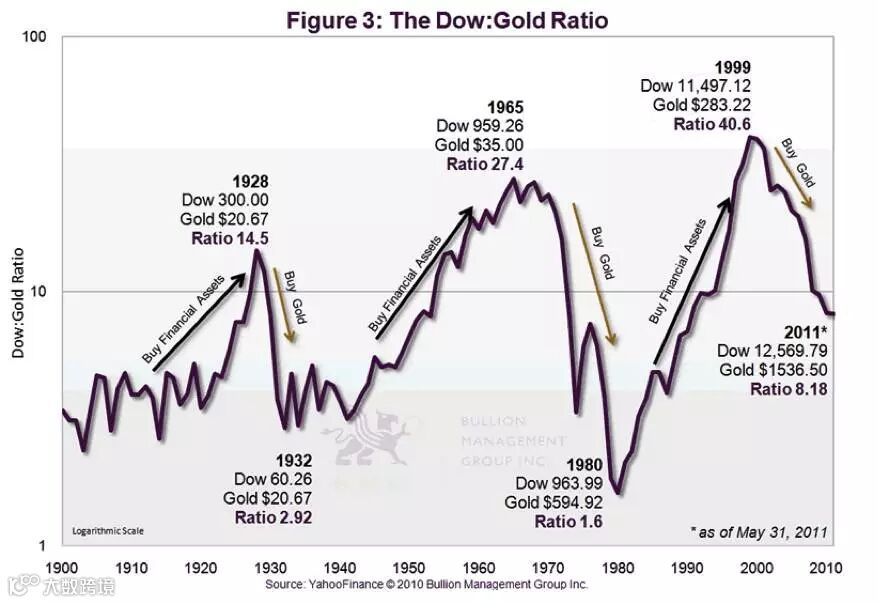 从本质上来说,道指/黄金的比率即道指除以美元计价的黄金价格。图3显示,当比率呈上升趋势时(20年代、60年代和90年代),投资组合中股票资产应该占主要权重。当比率下降时,比如70年代和2000年之后,我们可以增持贵金属商品。