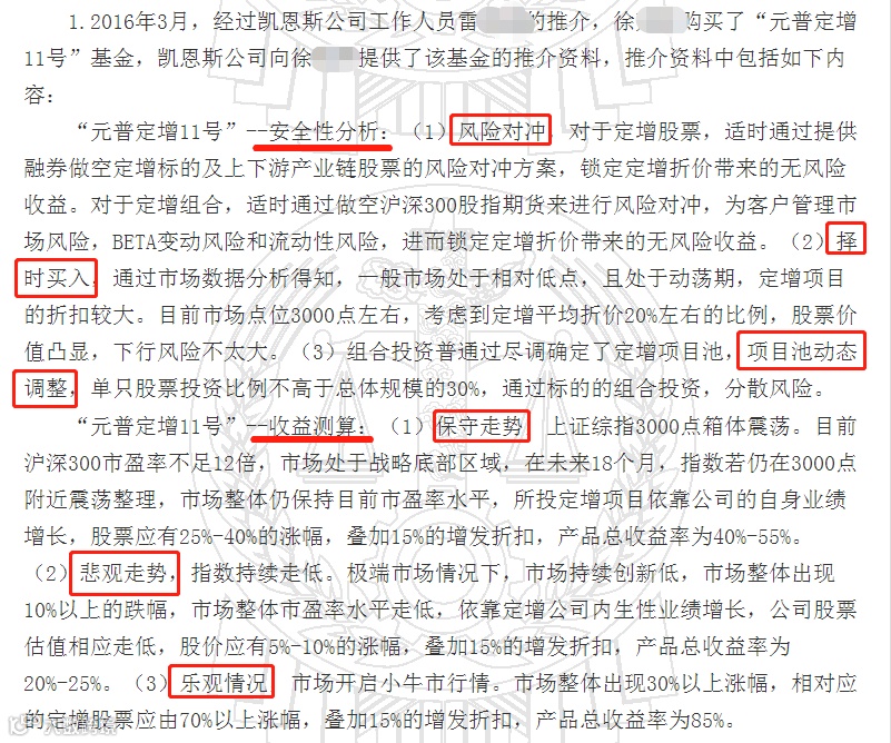 徐女士表示,推介材料中称可以“锁定定增折价带来的无风险收益”,基于对凯恩斯公司作为专业投资机构所作分析的信任,以为该产品属于没有风险的定增基金,就算无法获利但起码也可以保本。