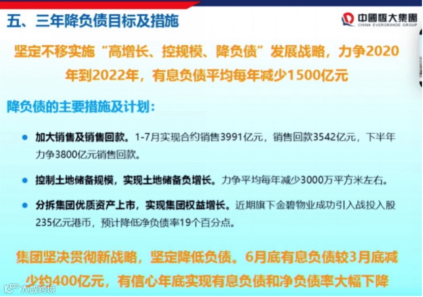 夏海钧表示,下半年恒大将继续以最大决心和力度降低负债:一方面,加大销售和销售回款,今年内部销售目标是8000亿元;另一方面,严格控制土地储备规模,力争平均每年减少3000万平方米,“土地储备每年负增长,可以节约一定资金。”