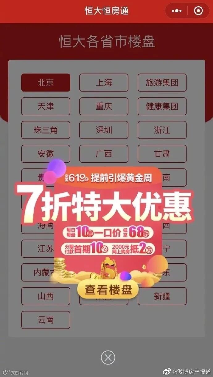 “金九银十”历年来都是各大房企实现全年销售的重大时机。为了实现抢收,恒大祭出了史上最强的全国楼盘7折特大优惠政策,同时还推出网上卖房2000抵20000、清尾最高88折等多重额外折扣让利。