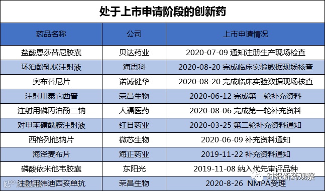 海思科的环泊酚乳状注射液和诺诚健华的奥布替尼片8月20日完成了临床实验数据现场核查,如进展顺利,有望在四季度获批上市。
