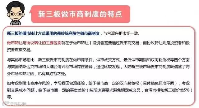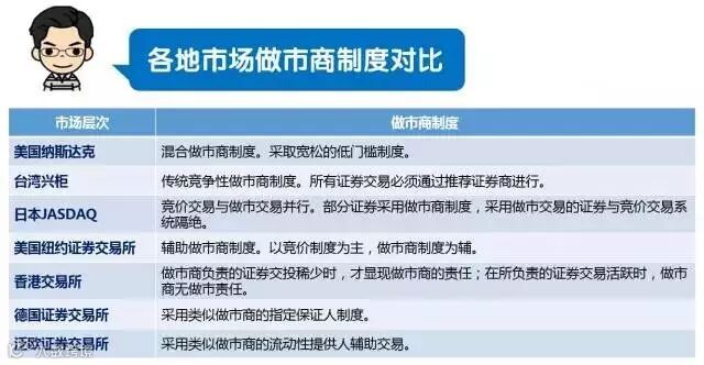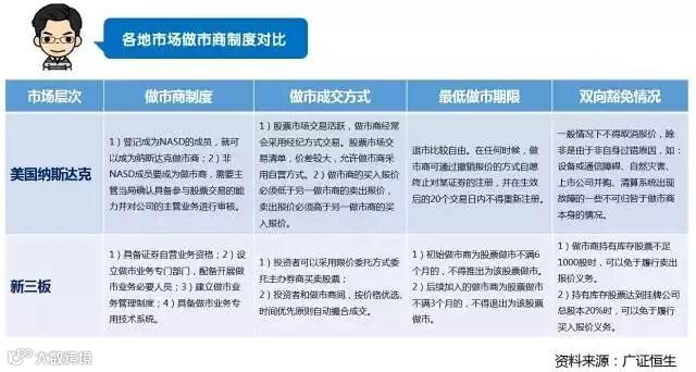 广东慧财与其他市场相比,新三板做市商制度在做市商条件、做市商成交方式、最低做市期限和双向豁免权等四个方面与美国纳斯达克市场存在差异,通过比较发现,我国新三板市场做市商制度既借鉴了海外市场成熟经验,也有其独特之处。