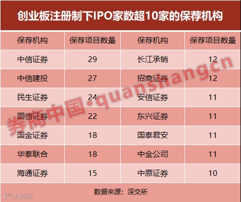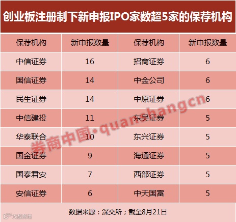 截至8月21日,深交所已受理365家企业的创业板注册制首发上市申请。从保荐机构项目排名情况来看,共有4家投行保荐项目数量超过20家。