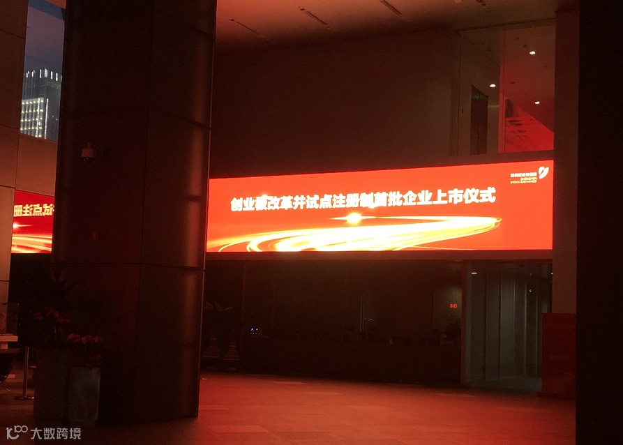 由于当天是周日,东广场的一楼大堂没有访客,主要的灯关了,前台上方的屏幕显示“创业板改革并试点注册制首批企业上市仪式”,为第二天做冲刺准备。