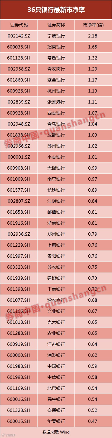 即便经历此前普涨之后,A股36只银行股仍有24只“破净”。据Wind数据,截至8月21日,仅有宁波银行、招商银行、常熟银行、青农商行、紫金银行、杭州银行、张家港行、西安银行、青岛银行、成都银行、苏州银行、平安银行等12家银行市净率超过1倍。