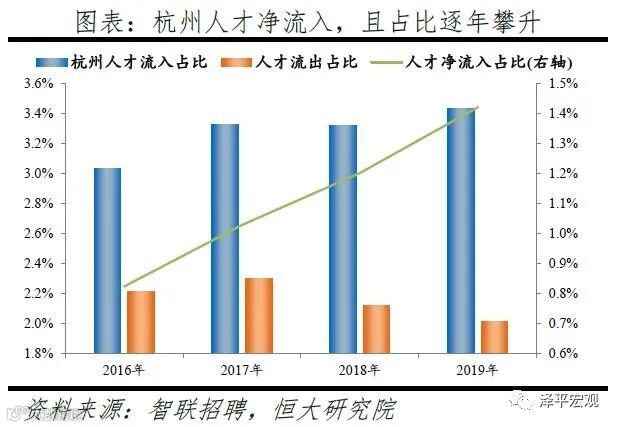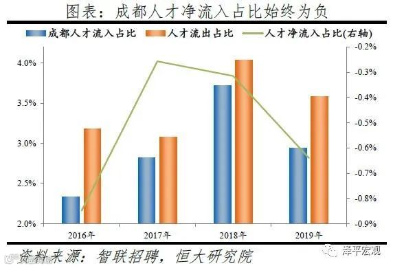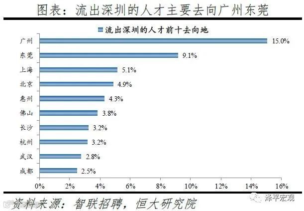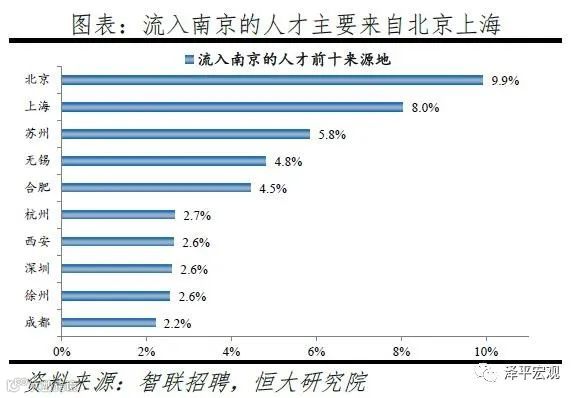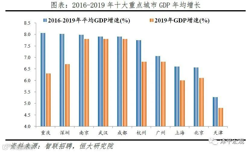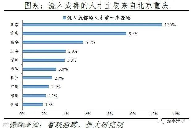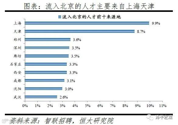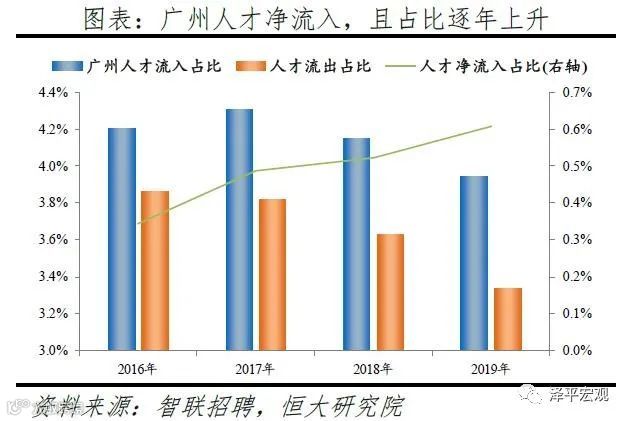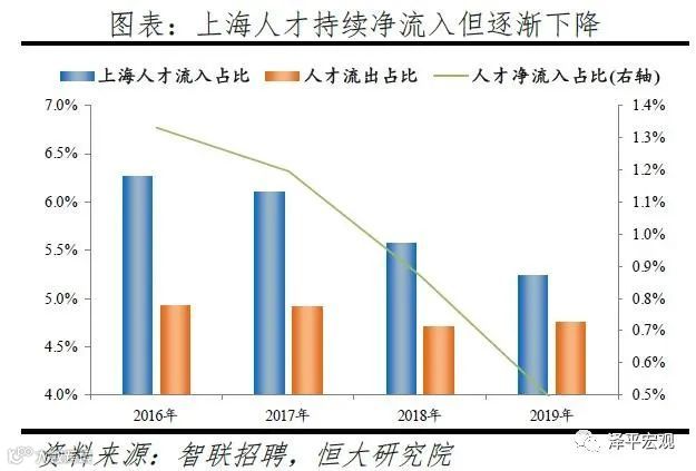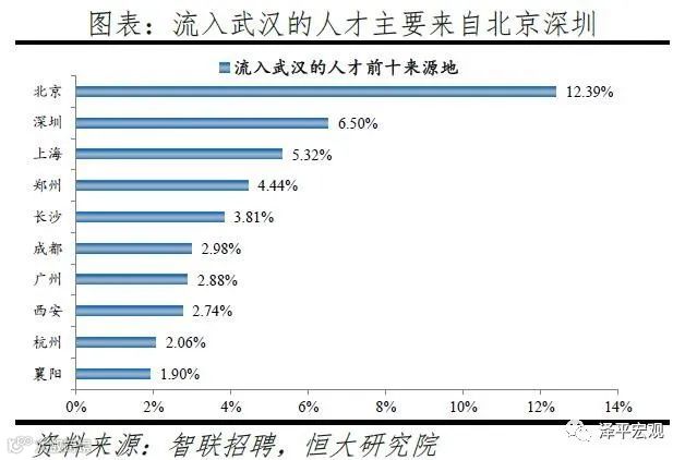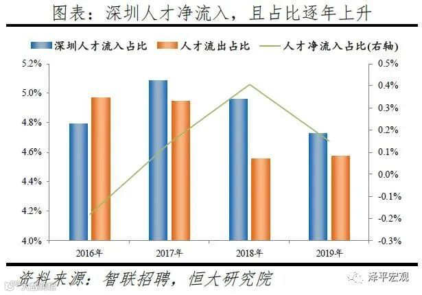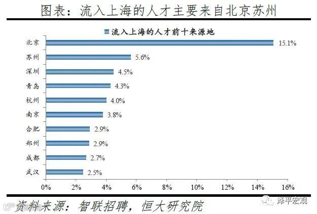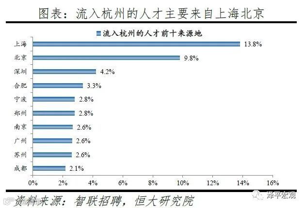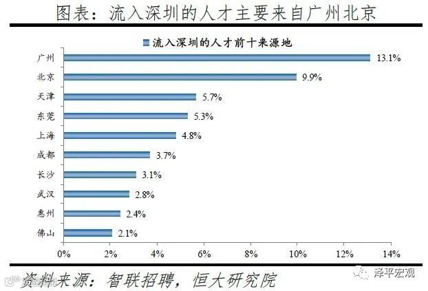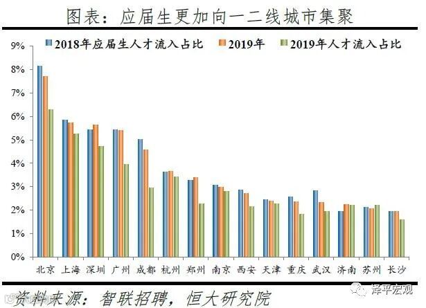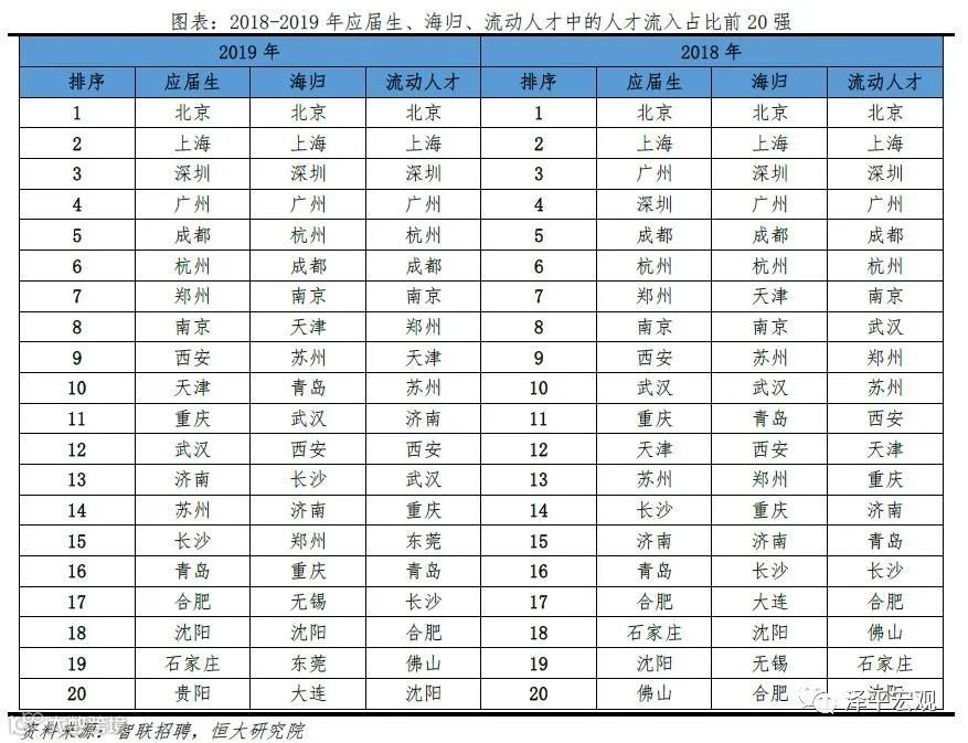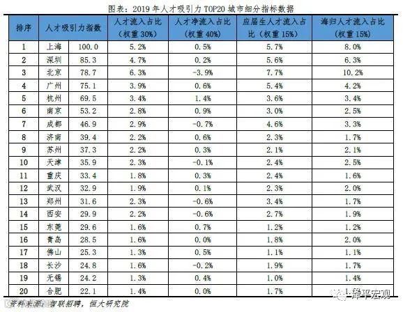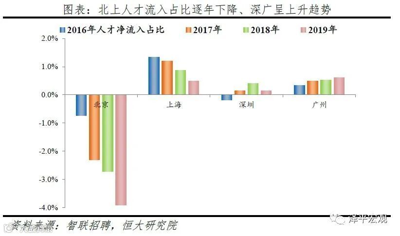 3)深圳:2016-2019年人才净流入占比分别为-0.2%、0.1%、0.4%、0.2%,主因深圳经济发展速度较快、人才政策有吸引力;深圳和广州互为人才外流第一目标城市,深圳流向广州和广州流向深圳的人才流出在全国流动人才总量中占比分别为0.7%、0.6%,规模基本平衡。2015年深圳常住人口增量从2014年的15万大幅上升至60万,2015-2018年平均增量为56万。2016-2019年深圳人才流入占比基本稳定在4.9%左右,分别为4.8%、5.1%、5.0%、4.7%,但人才流出占比呈下降趋势,分别为5.0%、4.9%、4.6%、4.6%。从来源看,人才向深圳流入的前十大城市分别为广州、北京、天津、东莞、上海、成都、长沙、武汉、惠州、佛山,合计占比达52.8%,高于2018年前十来源地的50.4%,深圳的人才来源集中度有所提高。其中,珠三角城市有4个,占比22.9%;流入深圳的人才中13.1%来自广州,流入广州的人才中17.4%来自深圳,深圳和广州互为人才来源城市的第1位。人才流入深圳主要因为经济发展速度相对较快和人才政策有吸引力。2019年深圳GDP增速6.7%,高于全国平均的6.1%,也高于北京和上海的6.1%、6.0%;2016-2019年深圳平均GDP增速为8.0%,高于广州、北京、上海的7.0%、6.6%、6.6%。深圳还拥有华为、腾讯、平安等众多著名企业,尤其是互联网企业,吸引大量人才。深圳的落户政策逐渐放宽,且补贴幅度较大,根据深圳市人力资源和社会保障局数据,2016年深圳将全日制本科生、硕士、博士的租房相关补贴从6000、9000、12000元分别提高至15000、25000、30000元,2017年落户门槛放宽至35岁以下专科学历人才,对新引进的两院院士和杰出人才、地方级领军人才、后备级人才分别给予300万、200万、160万的奖励。