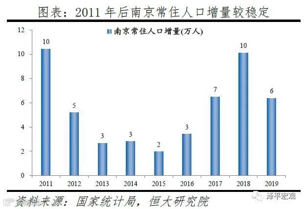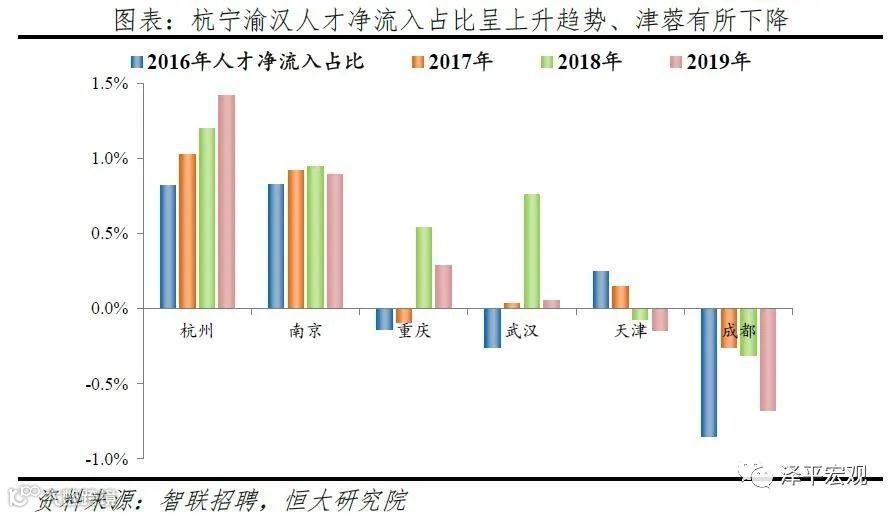 2)南京:2016-2019年人才净流入占比分别为0.8%、0.9%、0.9%、0.9%,始终为正且比较稳定,主因南京发展速度较快且2018年“宁聚计划”实施吸引人才。和上述其他城市相比,南京常住人口增量相对稳定,2011-2019年始终在2-10万区间波动、2019年为6万。2016-2019年南京人才流入占比分别为3.1%、3.0%、2.9%、2.8%,人才流出占比分别为2.3%、2.1%、1.9%、1.9%,均逐年下降,但人才流出明显大于流出,使得南京人才净流入占比分别为0.8%、0.9%、0.9%、0.9%,基本稳定。主要因为落户条件放宽且电子通信、制造业等行业增长速度较快。2018年“宁聚计划”即《人才落户实施办法》实施,不再以就业为落户前提,年龄条件也从35岁放宽到40岁。根据各市统计局数据,2019年南京GDP同比增长7.8%,不仅高于全国的6.1%,也在十大重点城市中排名第一;2018年南京规模以上工业增加值同比增长7.8%,高于全国的6.2%,其中,新能源汽车、工业机器人、集成电路产量分别增长253.1%、108.9%、29.6%,高于全国的66.2%、6.4%、11.2%。