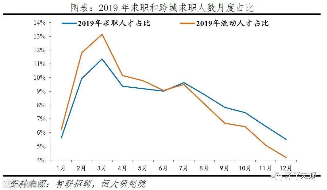 数据说明及特征:智联招聘拥有约2亿个人注册用户,日均活跃用户数(含登录、有求职行为的用户)约630万,其中,求职人才即当年有简历投递行为的用户中约85%为专科及以上学历,远超全国就业人口总体的14.6%(2015年小普查数据);在求职人才中,约四成为跨城求职者,即现居住城市和简历投向城市不同的流动人才。人才求职和跨城求职具有明显的月度波动性,求职高峰一般在春节后的3月,2019年3月求职人数和流动人数占比分别为11.3%、13.1%,2018年分别为12.1%、12.3%。