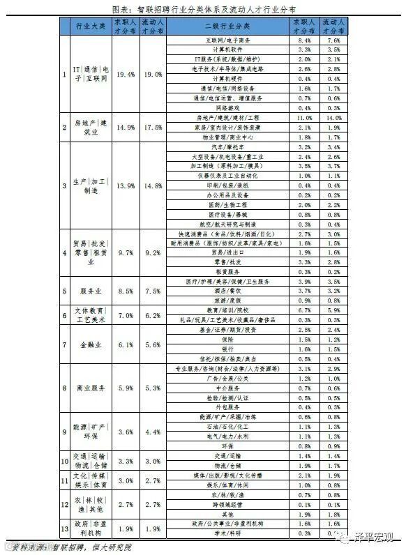 6)从行业看,流动人才中51%分布在IT、房地产、制造业,高于求职人才总体的48%。2019年求职人才最多的前三行业是IT|通信|电子|互联网、房地产|建筑业、生产|加工|制造,分别占比19.4%、14.9%、13.9%,合计占比48.3%;流动人才最多的前三行业也是上述三个行业,分别占比19.0%、17.5%、14.8%,合计占比51.4%,说明流动人才分布更加集中,且流动人才在房地产|建筑业的分布远高于求职人才。从二级行业分布来看,2019年求职人才最多的前五行业分别是房地产/建筑/建材/工程、互联网/电子商务、教育/培训/院校、医疗/护理/美容/保健/卫生服务、酒店/餐饮,合计占比33.7%;流动人才最多的前五行业则略有不同,第四和第五名分别是加工制造(原料加工/模具)、医疗/护理/美容/保健/卫生服务,合计占比34.7%。