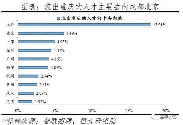 从来源看,人才向重庆流入的前十大城市分别为成都、北京、西安、长沙、上海、深圳、天津、贵阳、广州、武汉,合计占比达62.8%。其中,成都流入重庆占比达26.4%,高于大部分城市第一来源地占比,主要因为地理位置近且电子产业等具有较强吸引力。2019年重庆流入人才中25.7%流向IT|通信|电子|互联网行业,高于除杭州外的其余8个重点城市,也明显高于流出人才从事该行业的比例13.1%,其中2019年重庆流入人才中14.4%流向互联网/电子商务的二级行业中,显著高于其余9个重点城市。根据国家统计局和中国电子信息产业统计年鉴数据,重庆电子商务企业个数2013-2018年从640个增加到2545个;重庆规模以上电子信息企业个数2008-2017年从68个增加到540个。重庆市统计局数据显示,2019年1-11月重庆规上软件和信息技术服务业营收同比增长45.2%,高于全国2019年信息技术服务业营收增速的20.8%。从去向看,重庆人才外流的前十大城市分别为成都、北京、上海、深圳、广州、西安、杭州、贵阳、武汉、昆明,合计占比达51.0%。