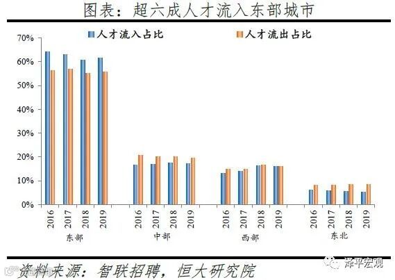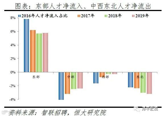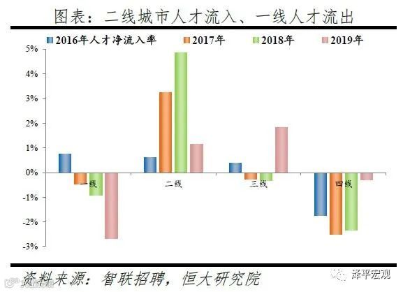 2)分线城市看,2019年一线、二线、三线、四线人才净流入占比分别为-2.7%、1.1%、1.8%、-0.3%,2018年分别为-0.9%、4.9%、-0.3%、-2.3%,结合近4年数据观察,一线因京沪控人持续流出,二线人才持续集聚,三线较为平衡,四线持续流出。我们把全国296个地级及以上建制市划分为一二三四线城市,其中,一线城市为北上广深4个,二线城市35个,三线城市81个,四线城市176个(详见恒大研究院2019年4月报告《中国城市发展潜力排名:2019》)。从人才流入流出占比看,2016-2019年一线城市人才流入占比呈下降趋势,人才流出占比基本稳定;二线城市人才流入占比分别为44.9%、46.3%、47.9%、46.4%,呈上升趋势且约半数人才流入二线城市,人才流出占比基本稳定;三线城市人才流入占比分别为20.5%、19.3%、18.6%、20.8%,2019年上升较为明显,人才流出占比逐年下降;四线城市人才流入占比分别为12.2%、11.6%、11.6%、12.6%,2019年上升较为明显,人才流出占比呈下降趋势。从人才净流入占比看,2016-2019年一线分别为0.8%、-0.5%、-0.9%、-2.7%,受京沪控人影响一线人才净流入占比逐年下降,2017年开始由正转负;二线分别为0.6%、3.2%、3.6%、1.1%,二线人才持续集聚;三线分别为0.4%、-0.3%、-0.3%、1.8%,较为平衡;四线分别为-1.8%、-2.5%、-2.3%、-0.3%,人才持续净流出。