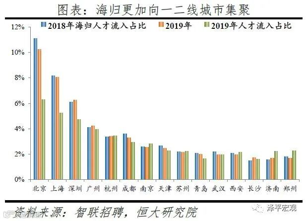 2019年应届生、海归将简历投向北上深广的比重分别占比24.5%、28.7%,均高于流动人才流向北上广深的整体比重20.2%,应届生和海归更倾向往一二线城市集聚。从应届生看,应届生人才流入占比前四名分别是北上深广,合计占比24.5%,高于北上深广的人才流入占比20.2%;应届生人才流入前十城市还有成都、杭州、郑州、南京、西安、天津,前十合计占比45.2%,高于前十城市的人才流入占比36.1%,意味着和流动人才相比,应届生人才更加向一二线城市集聚。和2018年相比,2019年流入北京、武汉、成都的应届生占比分别下降0.5%、0.5%、0.4%,流入济南、深圳的应届生占比分别上升0.3%、0.2%。