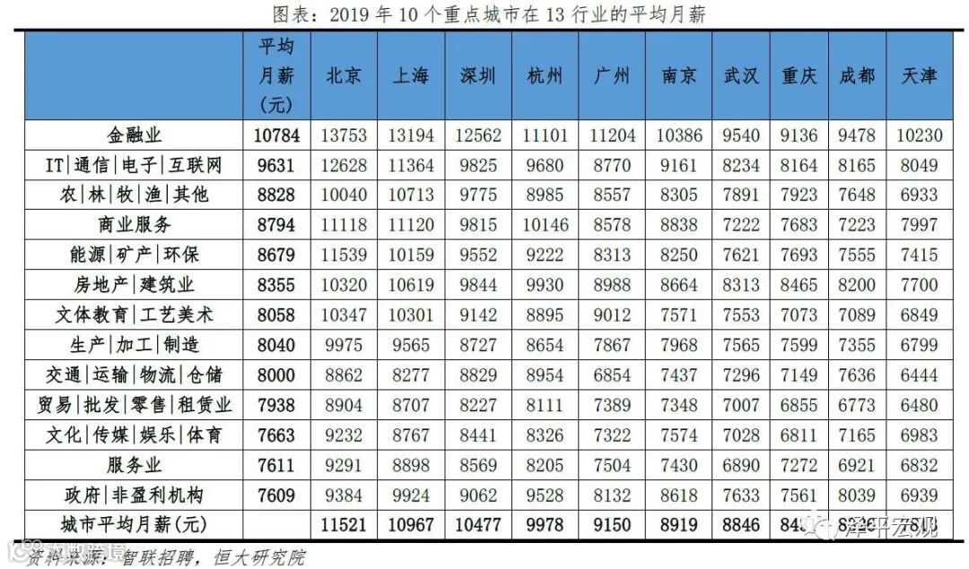 1)北京:2016-2019年人才净流入占比分别为-0.7%、-2.3%、-2.7%、-3.9%,持续为负且降幅扩大,主因北京严控人口、疏解产业;北京和上海互为人才外流第一目标城市,北京流向上海、上海流向北京的人才流出在全国流动人才总量中占比分别为0.8%、0.6%,人才从北京净流向上海。北京常住人口增量逐年下滑,2011-2018年从57万降至-17万,2019年缩窄至-1万,2017-2019年连续3年为负,2016-2019年北京的常住人口增量始终在一线城市中最低。2016-2019年北京人才流入占比分别为7.2%、7.3%、7.1%、6.3%,但人才流出占比持续攀升,分别达7.9%、9.6%、9.9%、10.2%,北京的人才流入和人才流出均居全国城市首位,但流出逐年攀升、流出明显大于流入,使得人才净流入占比分别为-0.7%、-2.3%、-2.7%、-3.9%。从来源看,2019年人才向北京流入的前十大城市分别为上海、天津、郑州、深圳、廊坊、石家庄、西安、成都、沈阳、武汉,合计占比达44.7%。其中,京津冀城市有3个,合计占比达15.6%。人才流入北京主要因为北京经济体量大、薪酬水平高,2019年GDP规模达到3.5万亿,仅次于上海、排名第二,同时13个行业中北京有8个的薪酬位于所有城市之首。