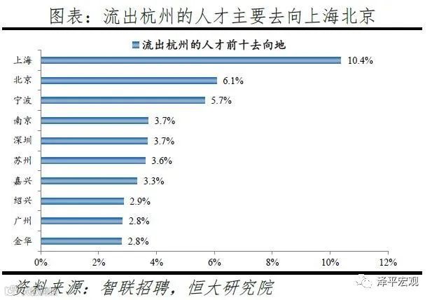 从来源看,人才向杭州流入的前十大城市分别为上海、北京、深圳、合肥、宁波、郑州、南京、广州、苏州、成都,合计占比达46.6%,明显高于2018年杭州人才前十来源地的44.0%,杭州的人才来源集中度有所上升。其中,来自上海和北京的人才合计占比23.6%,杭州发展所需人才主要在一线城市中,杭州也具有从一线城市抢夺人才的能力。且杭州前十来源地有5个来自长三角地区,合计占比达25.1%。人才流入杭州主要是因为产业发展迅速,尤其以阿里巴巴为代表的电商行业发展较快。根据杭州市统计局,2019年杭州数字经济产业增加值增长15.1%,其中,电子商务产业增加值14.6%,均高于杭州GDP增速6.8%。2019年杭州流入人才28.8%流向IT|通信|电子|互联网行业,明显高于其余9个重点城市,其中,12.8%流向互联网/电子商务二级行业,高于除重庆外的其余8个重点城市。同时杭州薪酬较有吸引力,在十个重点城市中位列第四,高于广州,其中13个行业中杭州有1个位列第一(交通|运输|物流|仓储),1个位列第二,2个位列第三,7个位列第四。从去向看,杭州人才外流的前十大城市分别为上海、北京、宁波、南京、深圳、苏州、嘉兴、绍兴、广州、金华,合计占比达44.9%。其中,有7个去向长三角地区,合计占比达32.3%。