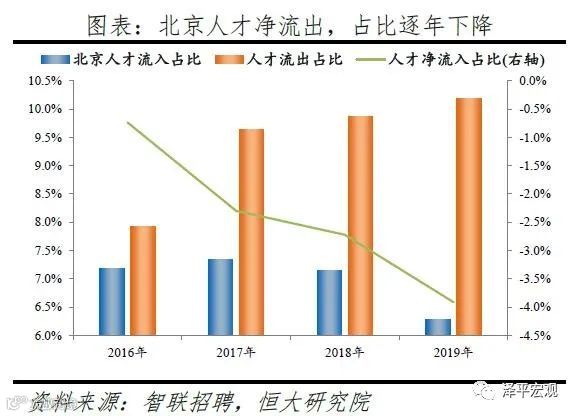 从去向看,北京人才外流的前十大城市分别为上海、天津、深圳、成都、廊坊、济南、杭州、广州、石家庄、西安,合计占比达42.5%。其中,流出北京的人才中7.7%流向上海,流出上海的人才中13.1%流向北京,北京和上海互为人才外流目标城市的第1位,北京流向上海和上海流向北京的人才流出在全国流动人才总量中占比分别为0.8%、0.6%,人才从北京净流向上海。流出北京的人才增多主要因为北京控制人口、疏解产业。2013年北京开始严控人口,2015年发布的《京津冀协同发展规划纲要》要求北京外迁非首都核心功能,2020年及之后北京常住人口控制在2300万人以内。根据北京市发改委,截至2019年底,北京市不予办理的工商登记业务累计达2.28万件;2014-2019年北京市退出一般制造业企业2759家,疏解提升市场631个、物流中心122个。根据国家统计局数据,2014-2018年北京规模以上工业企业单位数累计减少489家。2019年北京流出人才的29.7%来源于IT|通信|电子|互联网行业,高于除深圳外的其他8个重点城市,也高于北京流入人才流向该行业的比例23.4%。