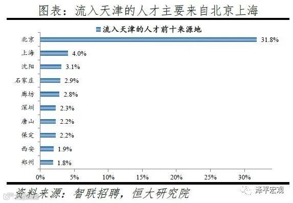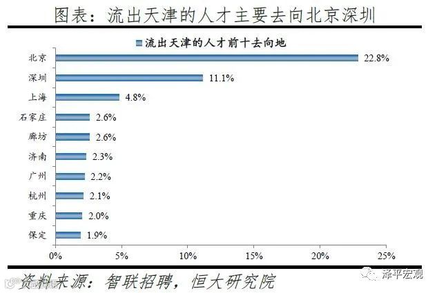 从来源看,人才向天津流入的前十大城市分别为北京、上海、沈阳、石家庄、廊坊、深圳、唐山、保定、西安、郑州,合计占比达55.1%。其中,北京占比高达31.8%,显著高于其余城市第一来源地占比,主要因为地理位置近。从去向看,的天津人才外流的前十大城市分别为北京、深圳、上海、石家庄、廊坊、济南、广州、杭州、重庆、保定,合计占比达54.5%。其中,北京占比22.8%,显著高于其余城市第一去向地占比,主要因为地理位置近且北京工作机会多。人才流出天津主要因为发展速度放缓且薪资水平低,根据各市统计局数据,天津2019年GDP增速为5.3%,在十大重点城市中倒数第一;2017-2019年GDP同比增速平均为4.0%,不仅远低于2010-2016年的平均增速12.6%,也远低于2017-2019年杭州、南京的平均增速7.2%、7.9%;同时天津薪酬较低,2019年4季度平均月薪为7813元,在十城中排名倒数第一,13个行业中天津有10个在十城中位列最后。