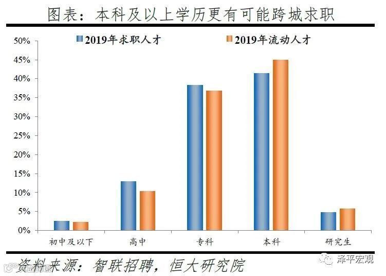 3)从学历看,流动人才中52%为本科及以上学历,明显高于求职总体的47%,表明高学历人才更有可能跨城求职。2019年求职人才中初中及以下、高中、专科、本科、研究生学历占比分别2.5%、13.0%、38.4%、41.5%、4.7%,其中流动人才各学历分别占比为2.1%、10.4%、36.8%、45.0%、5.7%,流动人才中本科、研究生学历比重均高于整体水平,2019年流动人才中本科及以上学历占比50.7%、较求职整体的46.2%高出4.5个百分点,而在2018年上述比例分别为50.5%、47.5%,说明本科及以上的求职者职场竞争力较强、更有可能跨城求职。