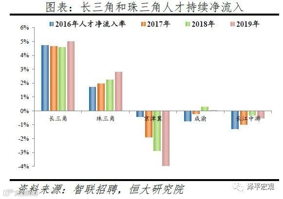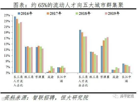3)分城市群看,超6成人才流向五大城市群,2019年长三角、珠三角、京津冀、成渝、长江中游城市群人才净流入占比分别为5.0%、2.8%、-4.0%、0.0%、-0.5%,长三角、珠三角人才集聚,京津冀受北京控人影响人才净流出,成渝和长江中游基本平衡。从人才流入流出占比看,长三角人才流入占比和人才流出占比均呈下降趋势,2019年分别为22.6%、17.6%;珠三角人才流入占比较为稳定,人才流出占比分别逐年微降,2019年分别为13.9%、11.1%;京津冀2016-2019年人才流出占比分别为14.3%、16.2%、17.0%、17.3%,逐年上升;成渝人才流入占比和人才流出占比均较为稳定;长江中游人才流出占比逐年下降。2016-2019年分别有64.6%、64.7%、64.5%、63.1%的人才流入五大城市群,均超6成。从人才净流入占比看,2016-2019年长三角分别为4.7%、4.6%、4.6%、5.0%,人才净流入且占比高于其他城市群,人才大量向长三角集聚;珠三角分别为1.7%、2.0%、2.2%、2.8%,人才净流入且逐年上升;京津冀分别为-0.4%、-1.9%、-2.9%、-4.0%,人才净流出且流出规模逐渐扩大,主要受北京人才净流入占比逐年大幅下降影响;成渝分别为-0.7%、-0.2%、0.3%、0.0%,流入流出基本平衡;长江中游分别为-1.3%、-1.0%、-0.3%、-0.5%,流入流出基本平衡。