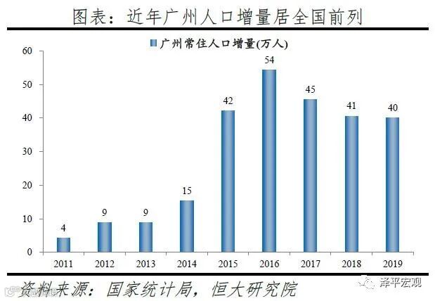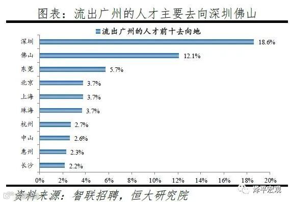 从来源看,人才向广州流入的前十大城市分别为深圳、北京、佛山、东莞、上海、长沙、成都、武汉、珠海、郑州,人才流入占比合计达50.8%。其中,深圳占比17.4%,珠三角城市有4个,合计占比29.6%。人才流入广州主要因为发展速度较快、生活成本较低。2019年广州GDP增速为6.8%,高于北京、上海、深圳的6.1%、6.0%、6.7%。广州的生活成本在一线城市中最低,根据英国经济分析智囊机构经济学人智库(EIU)发布的《2019年全球生活成本调查报告》,在全球133个城市样本中,上海与深圳排名并列第25位,北京、广州分别排名49、68位;2018年北京、上海、深圳、广州的房价收入比分别为27.8、21.5、23.8、14.8年,广州的房价和生活成本在一线城市中最低。2019年广州流入人才的13.3%、5.3%流入贸易、批发、零售、租赁业,以及服务业,明显高于其余9个重点城市。从去向看,广州人才外流的前十大城市分别为深圳、佛山、东莞、北京、上海、珠海、杭州、中山、惠州、长沙,人才流出占比合计达57.2%。其中,深圳和佛山占比分别为18.6%、12.1%,珠三角城市有6个,合计占比44.9%,与北京13.6%的人才流向京津冀都市圈、上海25.9%的人才流向长三角都市圈和深圳32.3%的人才流向珠三角都市圈相比,广州人才流向珠三角都市圈城市的比重显著更高。一方面是因为珠三角多为粤语城市、文化相近,另一方面是广州高校数量较多,广东省人才为求学向广州集聚,毕业后从广州回流至省内其他城市。根据教育部数据,广州普通高校数、211高校数分别为37、6所,分别排名第5、6名;根据国家统计局数据,2018年广州普通本专科在校生人数为108.6万人、位列全国第一。