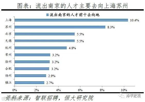 从来源看,人才向南京流入的前十大城市分别是北京、上海、苏州、无锡、合肥、杭州、西安、深圳、徐州、成都,合计占比达45.7%。其中,有5个是长三角地区,合计占比达25.8%。从去向看,南京人才外流的前十大城市分别为上海、苏州、北京、无锡、杭州、常州、徐州、合肥、扬州、镇江,合计占比达49.5%。其中,有8个是长三角地区,合计占比达40.8%。南京和长三角的人才互动非常频繁,部分因为南京高校较多,长三角人才为求学向南京集聚,毕业后从南京回流至长三角其他城市。根据教育部数据,南京普通高校数、211高校数分别为34、10所,分别排名第6、3名。