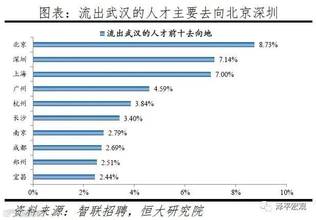 从来源看,人才向武汉流入的前十大城市分别为北京、深圳、上海、郑州、长沙、成都、广州、西安、杭州、襄阳,合计占比达45.0%。从去向看,武汉人才外流的前十大城市分别为北京、深圳、上海、广州、杭州、长沙、南京、成都、郑州、宜昌,合计占比达45.1%。