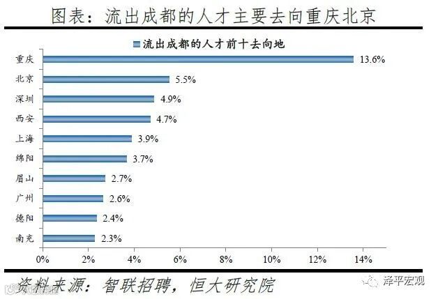 从来源看,人才向成都流入的前十大城市分别为北京、重庆、西安、上海、深圳、绵阳、长沙、广州、郑州、贵阳,合计占比达47.5%。从去向看,成都人才外流的前十大城市分别重庆、北京、深圳、西安、上海、绵阳、眉山、广州、德阳、南充,合计占比达46.2%。其中,流出重庆的人才中17.9%流向成都,流出成都的人才中13.6%流向重庆,重庆与成都互为人才外流目标城市的第1位,成都流向重庆和重庆流向成都的人才流出在全国流动人才总量中占比分别为0.5%、0.4%,人才从成都净流向重庆。2019年成都流出人才的30.6%来源于房地产|建筑业,显著高于其他9个重点城市,且远高于成都流入人才流向该行业的比例13.1%。