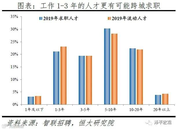 4)从工作年限看,流动人才中46%工作5年及以下,高于求职总体的44%,职场新人更有可能跨城求职。2019年求职人才中工作年限为1年及以下、1-3年、3-5年、5-10年、10-20年、20年以上分别占3.1%、21.1%、19.4%、30.3%、22.3%、3.8%,流动人才中各工作年限人才分别占比3.3%、23.0%、19.3%、28.2%、21.9%、4.3%,其中工作5年以下的分别占比43.6%、45.7%,说明部分职场新人的职业发展和生活愿景尚有较大不确定性、更有可能跨城求职。而在2018年上述比例分别为39.3%、40.4%,2019年流动人才更加集中于5年及以下。