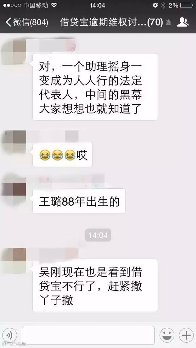 由于借贷宝利息实在太高,不少逾期(还不上钱)的借款人发起成立了“维权群”商量对策,而人人行科技(借贷宝)悄然变更了公司法人的消息最开始就是从这些维权群被挖掘出来的。
