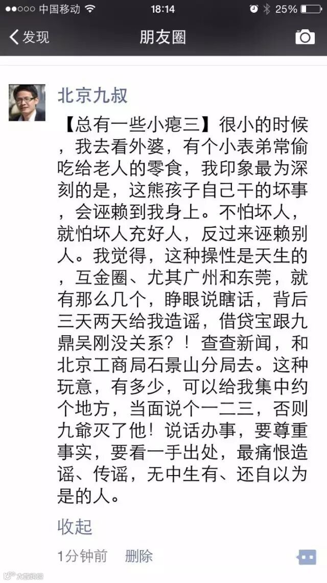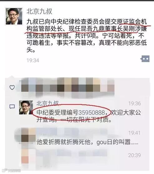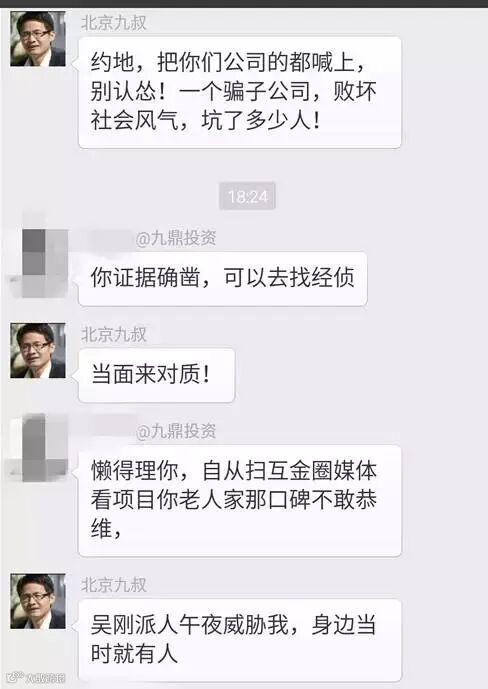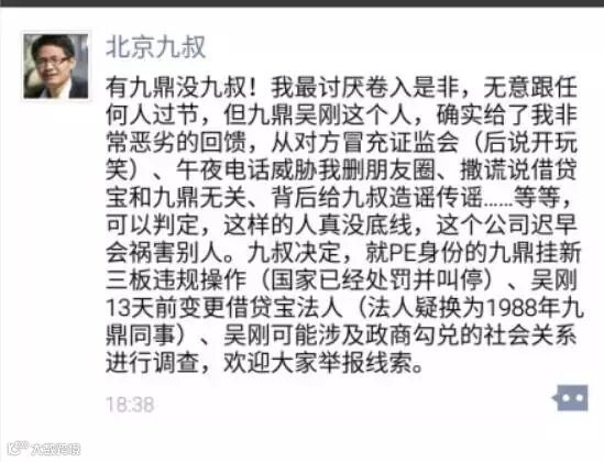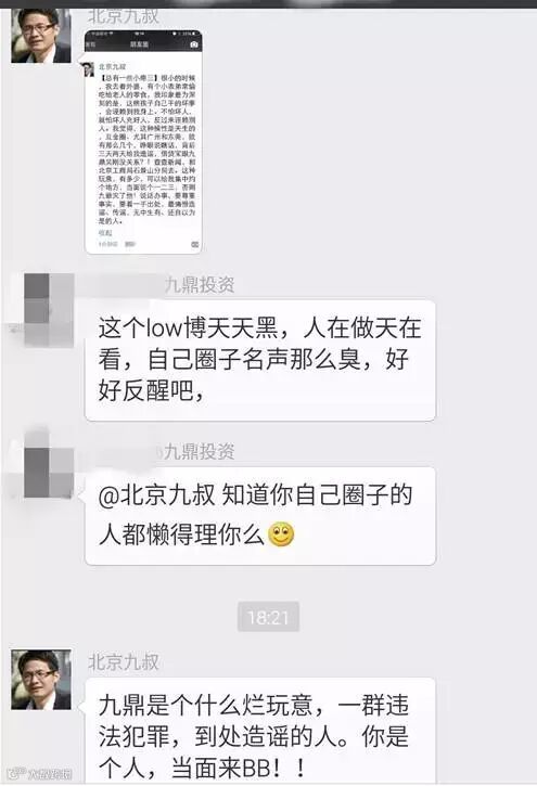 而据“北京九叔”介绍,他发表相关言论后受到了来自九鼎方面的“压力”,于是“北京九叔”,怒了
