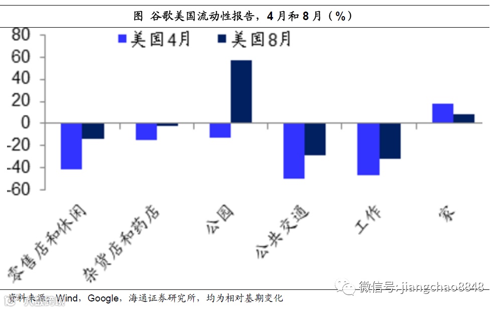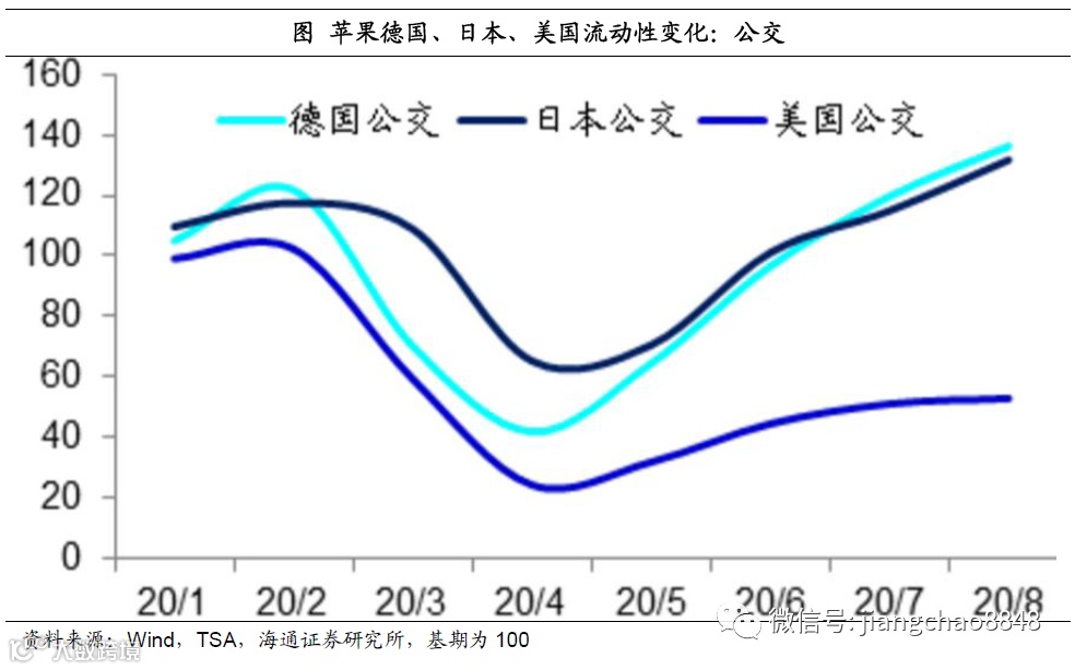 而从乘坐公交的数据来看,美日德的流动性低点同样是在今年4月份,之后就开始持续恢复。到8月初,日本和德国乘坐公交的比例已经比1月基期高出30%,只有美国依然低于1月份的基期,但也在持续改善。