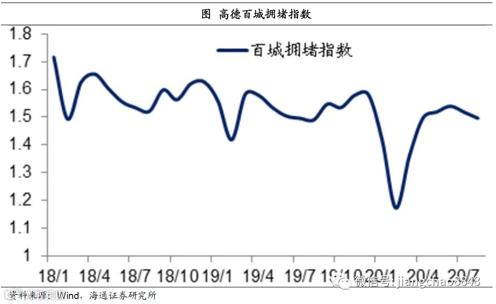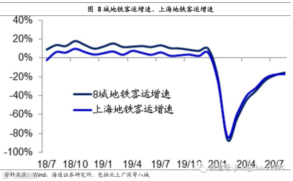 随后,以地铁为代表的市内公交出行也开始明显恢复。我们统计的北上广深等8城地铁客运数据显示,2月份的8城地铁客流同比降幅超过80%,到8月初的同比降幅已经不到20%。