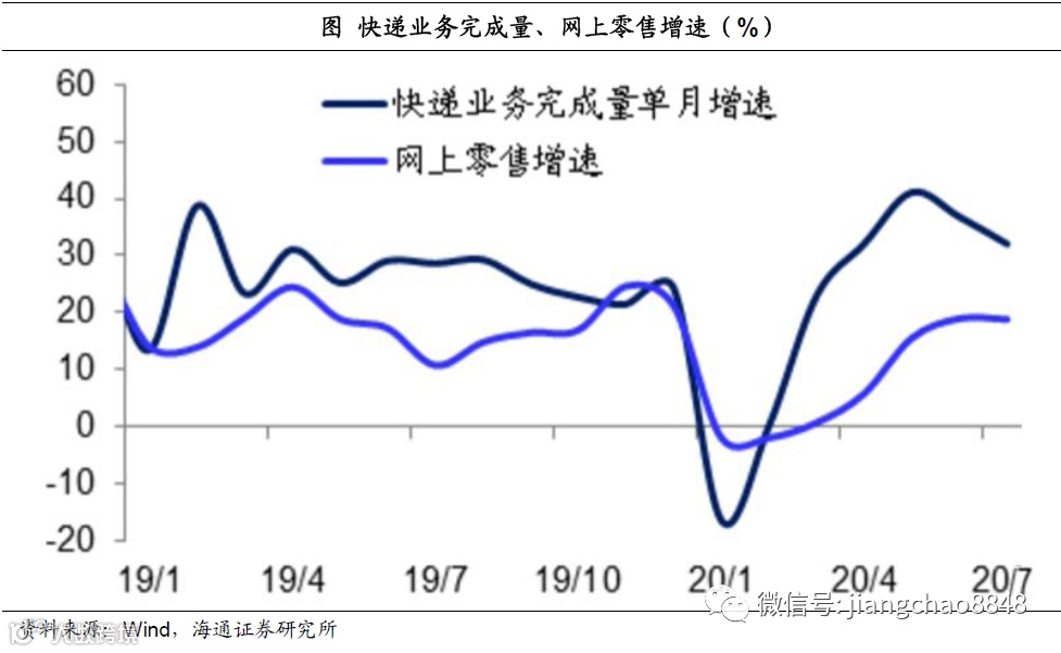 网上经济蓬勃发展的一个重要体现是网上零售的高增长。今年的网上零售只是在前两月出现了小幅的负增长,在3月份的增速就由负转正,到7月份的增速已经接近20%。与之相对应的是,全国快递业务完成量在1月出现了负增长,但2月就由负转正,4月以来的增速均超过30%。