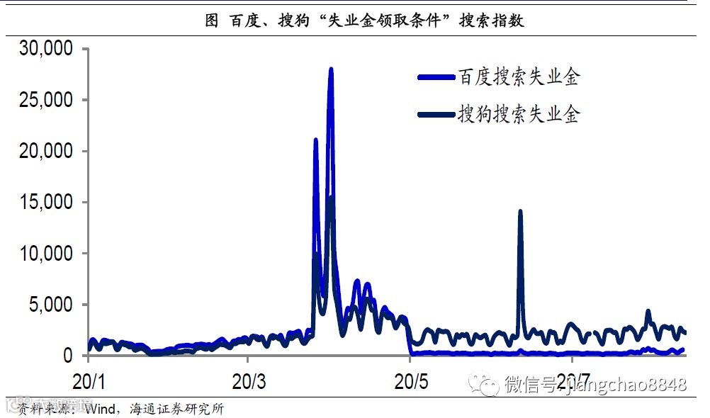 但如何印证服务经济的复苏?服务业主要是与人有关的经济,因而就业数据是服务业发展的重要验证。从百度和搜狗等搜索引擎中“失业金领取条件”关键词的搜索频率来看,最高峰的时期是在今年的3月末和4月初,此后搜索频率开始持续下降,这意味着4月以后中国的就业市场就出现了改善。