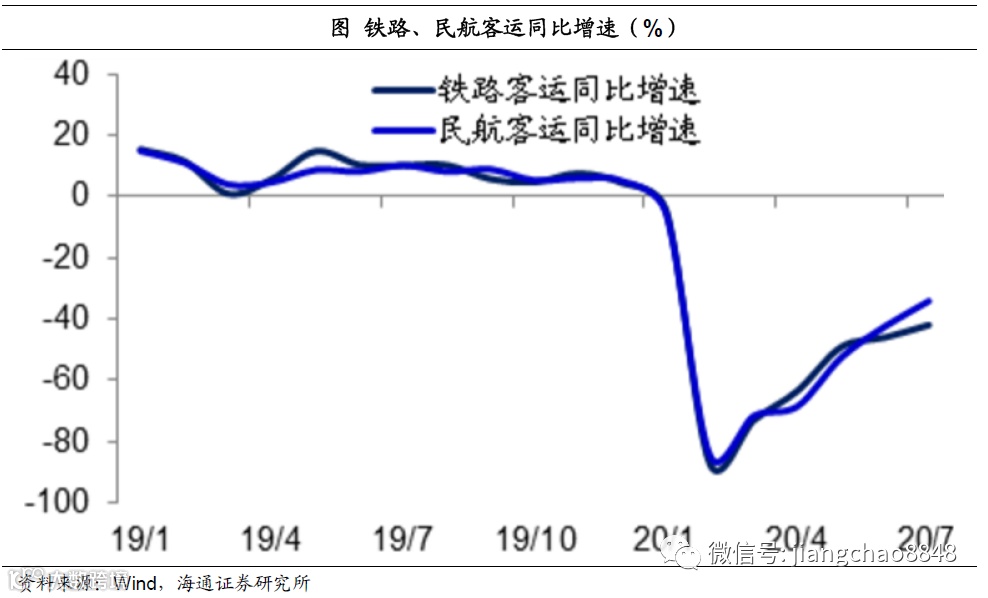 之后,远途出行的铁路和民航客流也开始恢复。今年2月份,中国民航客运同比降幅高达84.5%,铁路客运同比降幅高达87.2%,到7月份的全国民航客运同比降幅缩窄至34.1%,铁路客运同比降幅缩窄至40%左右。