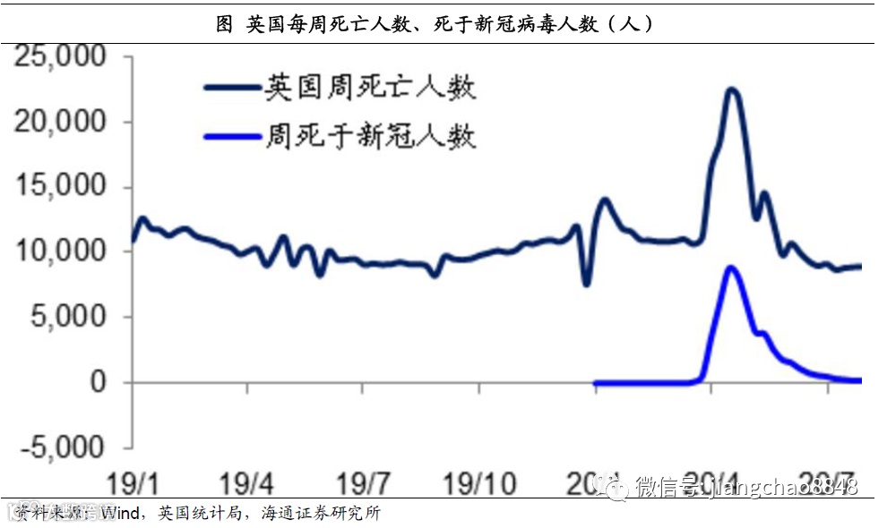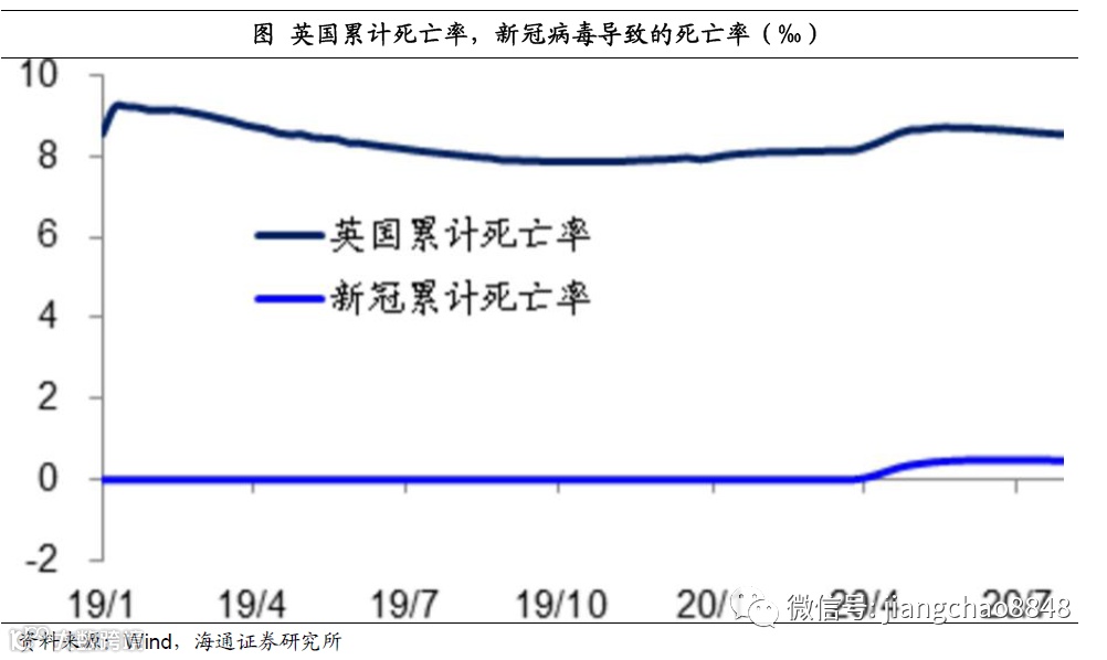 从我们测算的英国人口累计死亡率来看,由于新冠病毒的影响,英国的人口死亡率从8.1‰最高升至8.7‰,但并未明显偏离正常年份的死亡率,而且目前已经重新开始下降。