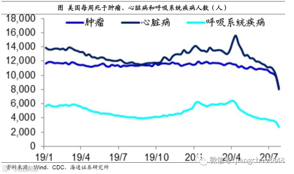 而且根据美国CDC6月份的《发病率和死亡率周报》,在统计了130万新冠病例之后,发现患有心脏病等慢性病患者死于新冠病毒的风险比健康人高出12倍,这意味着很多死于新冠病毒的患者本身可能也患有各种慢性疾病,其结果就是在7月份以后死于心脏病、肿瘤等慢性疾病的人数出现了明显下降。