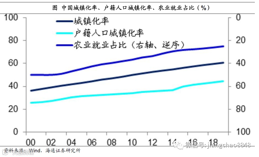 虽然大家都不太喜欢房地产拉动经济发展的模式,但现实的情况是,中国的房地产周期依然没有结束。从长期来看,中国目前的城镇化率为60%,而成熟期的城市化率通常为80%以上。目前中国农业就业人口占比超过20%,未来随着农业就业人口占比的进一步下降,城镇化率仍有提升空间。与此同时,由于户籍制度的限制,目前我国的户籍人口城镇化率仅为44%,而随着政府放开中小城市落户的限制,户籍人口城镇化率提升的空间更大,这有助于都市圈和城市群的发展。