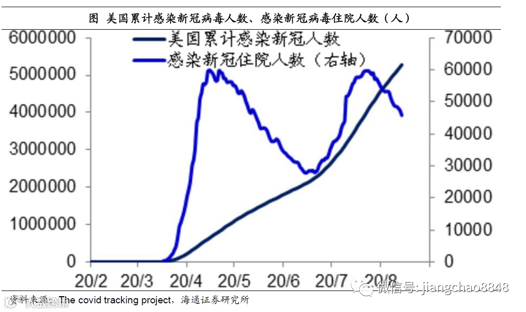 以美国为例,目前美国是全球感染新冠病毒最多的国家,其累计感染人数已经超过500万人,而且每周的新增感染人数依然维持在40万人左右的历史高峰。但是由于治疗水平等的进步,美国感染新冠病毒住院的人数已经从4月份6万人左右的高峰下降至当前的4.6万人。