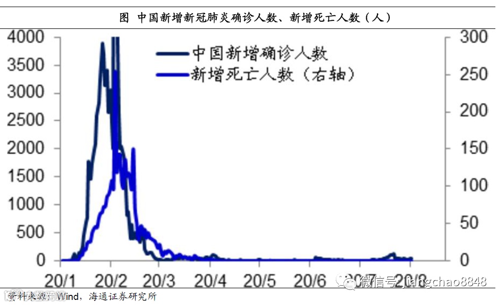 无论是从新增感染新冠肺炎的人数、还是新增死于新冠肺炎的人数,中国都是在2月份达到高峰、在3月中旬以后就持续位于低位水平,这意味着中国疫情的顶峰发生在2月份,在3月份以后疫情就开始持续改善。