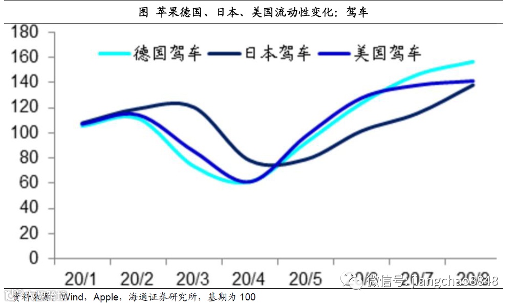 在今年1月份,苹果也推出了流动性报告,其主要监测的是各国驾车、乘坐公交或者徒步出行的比例变化。数据显示,今年4、5月份是美日德各国流动性的最低点,从5月份开始流动性出现明显改善,目前美日德三国驾车出行的比例已经显著超过了1月份的水平。