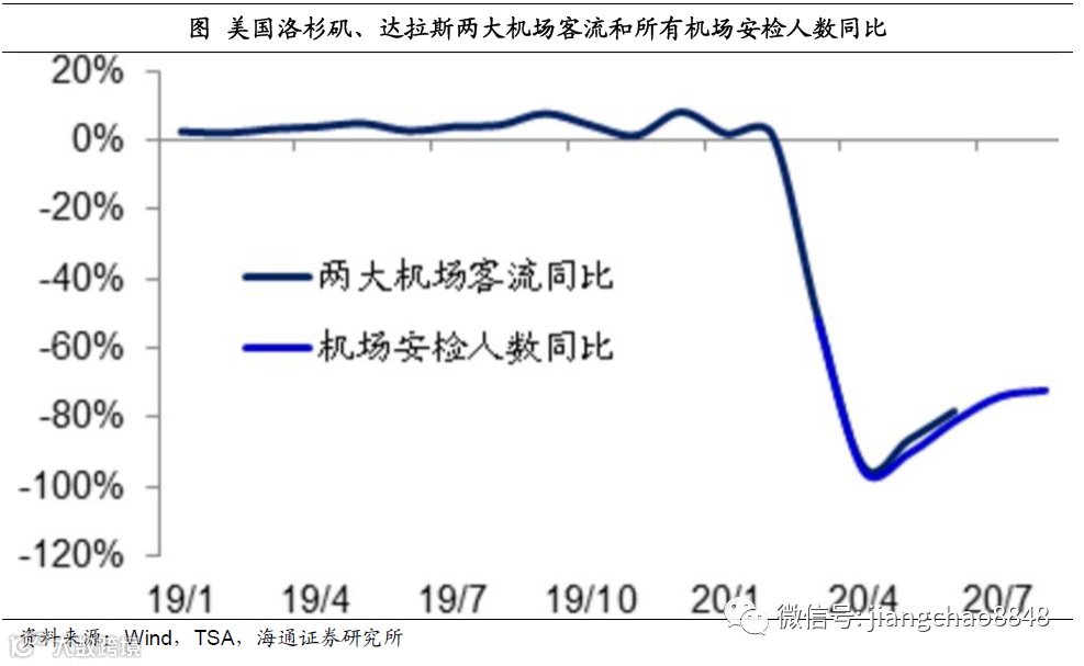在所有出行当中,冻结最严重的当属飞机出行。我们统计美国洛杉矶和达拉斯两大机场的客流数据,在4月份疫情最严重的时期,其客流同比降幅超过90%,同期美国所有机场安检人数同比降幅超过95%。而从5月份开始,机场客流开始缓慢恢复,进入8月份以后,美国机场安检人数同比降幅已经缩窄到70%左右。
