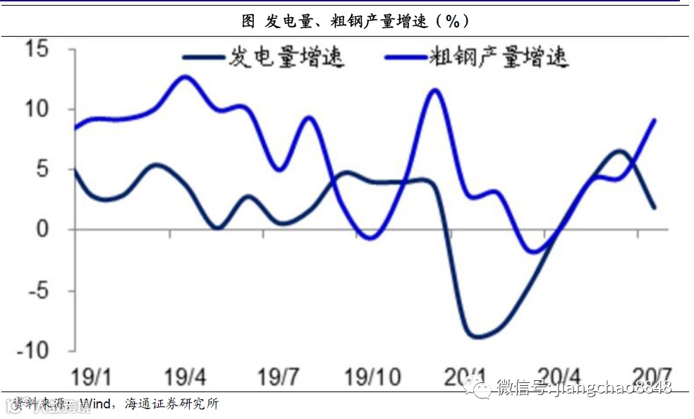 而生产的回升也得到了微观数据的印证。在所有实物指标中,最重要的是发电量增速,因为所有行业几乎都需要用电。发电增速在今年前两月的降幅高达8.2%,但4月份以后的发电量增速就回到了正值区间。此外,粗钢产量增速也在4月份以后转正,并且在7月份创出9.1%的年内新高。