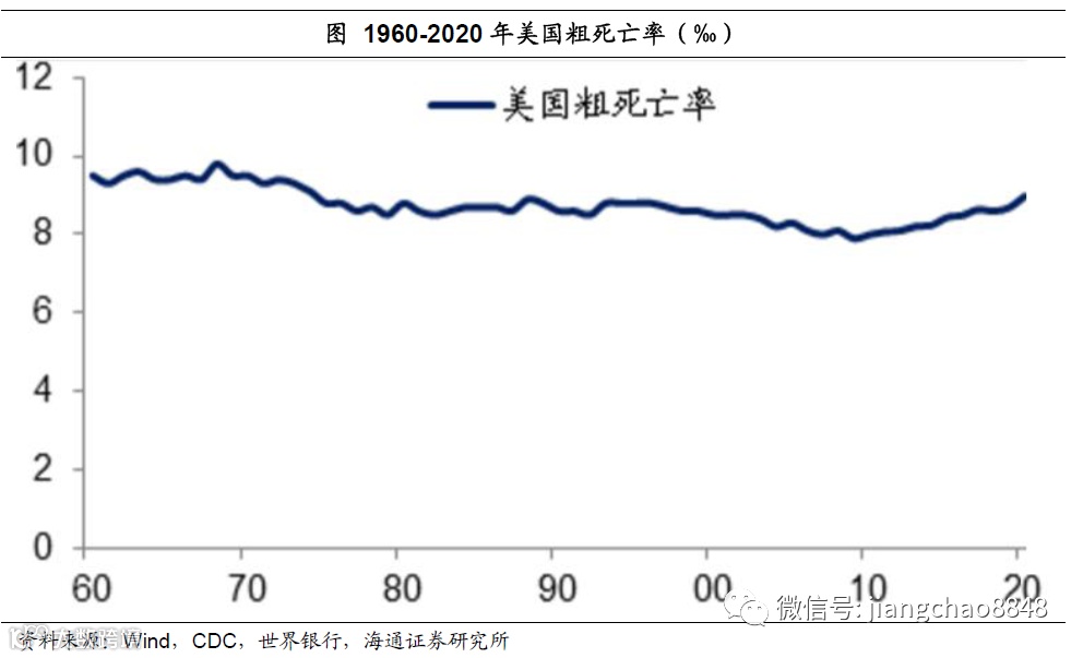 即便是放在过去60年的背景下来观察,今年美国的粗死亡率也并未显示出明显的异常,位于8.8‰的历史平均水平附近。