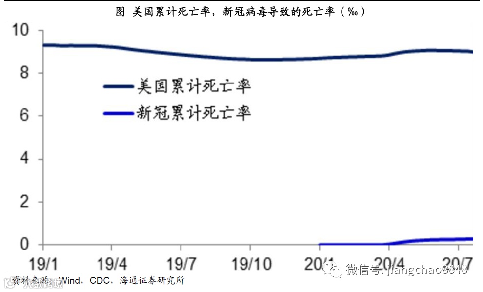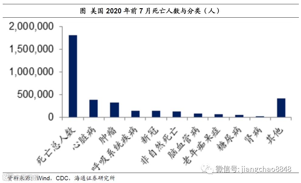 因此,虽然新冠病毒在4、5月时导致了美国每周死亡人数从6万左右最高升至8万人,但在进入7月以后,由于死于各种慢性疾病人数的大幅下降,美国每周总死亡人数已经降至4万人。因此从累计的角度来看,美国今年的总死亡人数相比于正常年份并没有大幅增加。