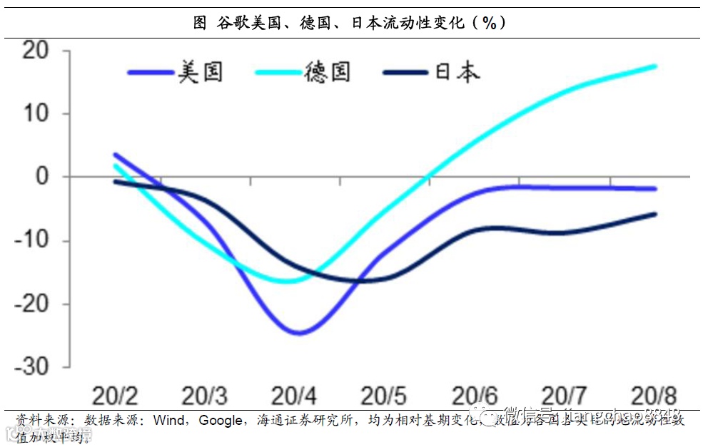 新冠疫情对经济的影响主要体现在人口流动性下降,减少了经济活动和产出。谷歌在今年推出了人口流动性报告,追踪各国的流动性变化。美国、日本和德国的数据显示,疫情导致流动性冻结最严重的时期是今年的4、5月份,这恰好也对应了上述全球和美国的新冠死亡率的顶峰时期。而从5月份开始,美日德各国的人口流动性已经先后出现了改善,并且一直持续至今。其中德国的总体流动性已经超过了2月份的基期,而美国和日本也恢复到接近2月份的水平。